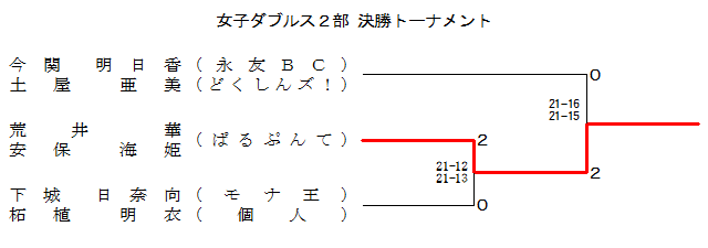 | 今関 明日香 (永友BC) 土屋 亜美 (どくしんズ!) | ○ −X | ○ 21- 8 21- 7 | ○ 21- 5 21-16 | 1 | |