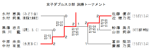 | 女子ダブルス3部 Bブロック | 冨田 廣瀬 | 宮澤 三浦 | 赤瀬川 棚原 | 大場 松井 | 順位 |